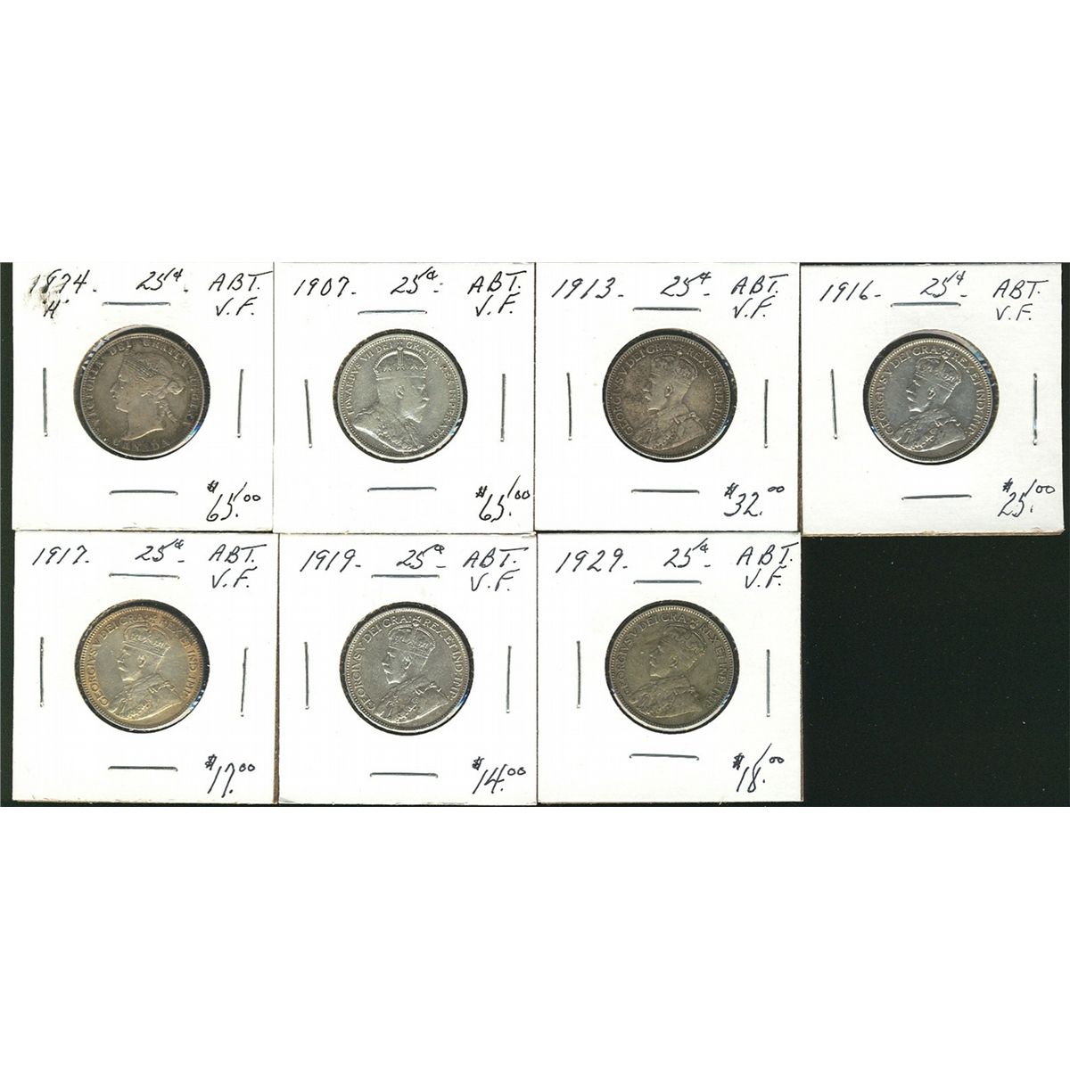 1874H 25¢, 1907, 1913, 1916, 1917, 1919 & 1929. Lot of 7 coins all Abt VF. (PBA).