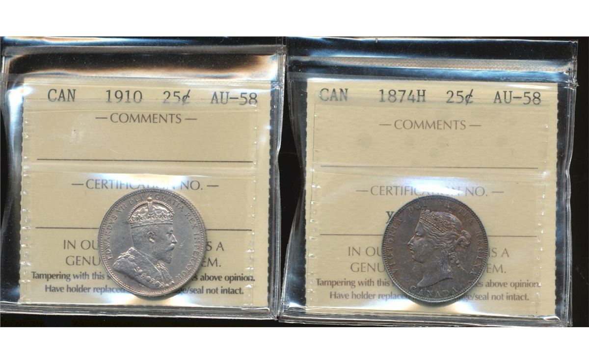 1874H 25¢ & 1910 ICCS AU58. Lot of 2 coins.
