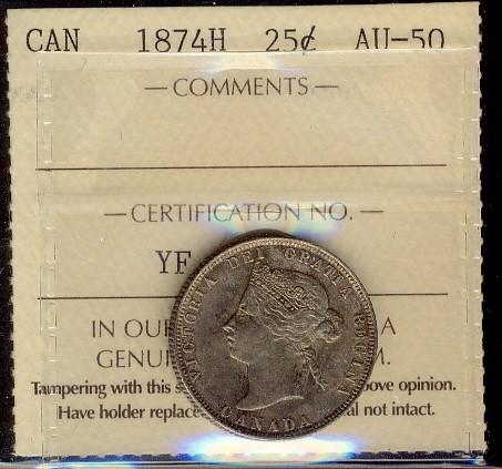 1874H 25¢ ICCS AU50. Light golden brown tone.