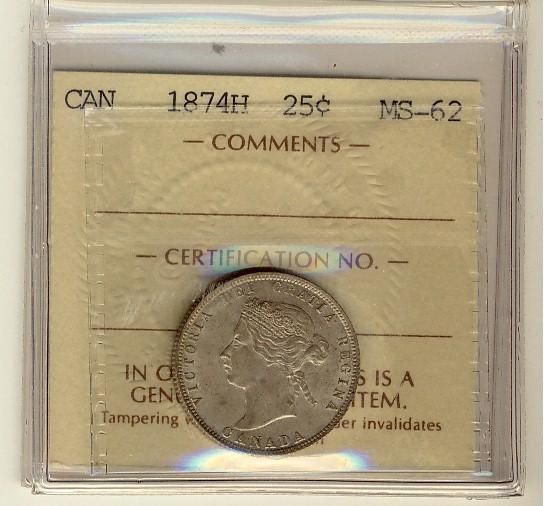 1874H 25¢ ICCS MS62. Well struck and lustrous example.