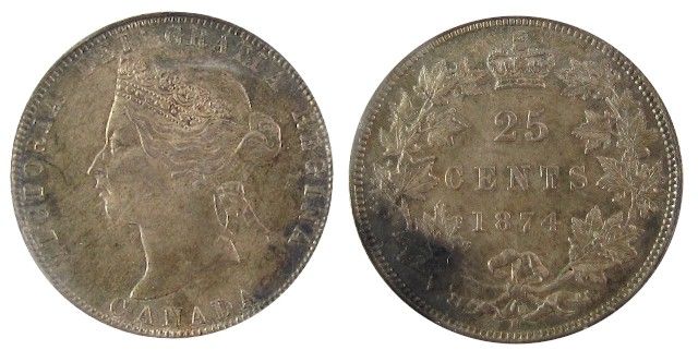 1874H 25¢ ICCS MS64. Attractive fog of gold with strong underlying lustre.