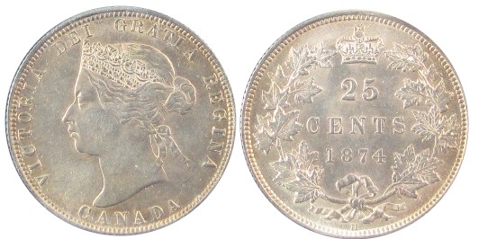 1874H 25¢ ICCS MS64. Attractive light golden to green tones.