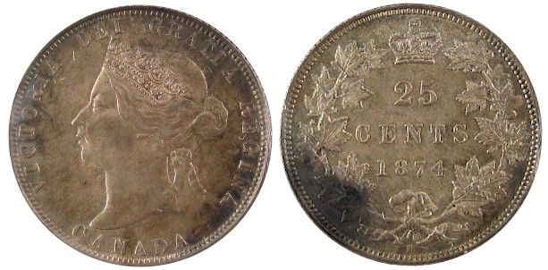 1874H 25¢ ICCS MS64. Tp 3 example. Golden to green shades with underlying lustre.