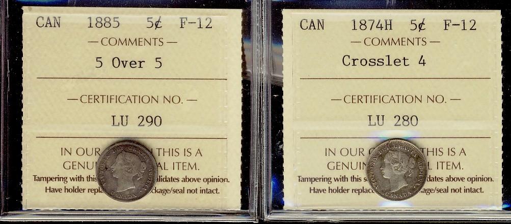 1874H 5¢ Crosslet, 1885 5 over 5. Lot of 2 ICCS graded coins, both F12.