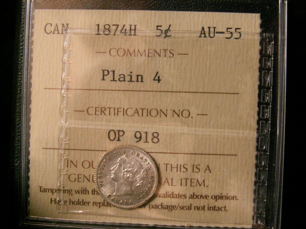 1874H 5¢ Plain 4 ICCS AU55. Lustrous and white.