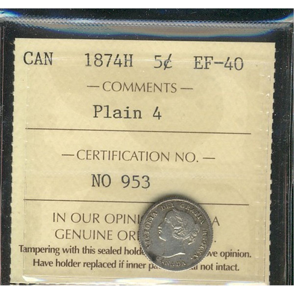 1874H 5¢ Plain 4. ICCS EF40, key variety.