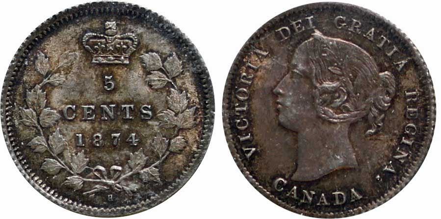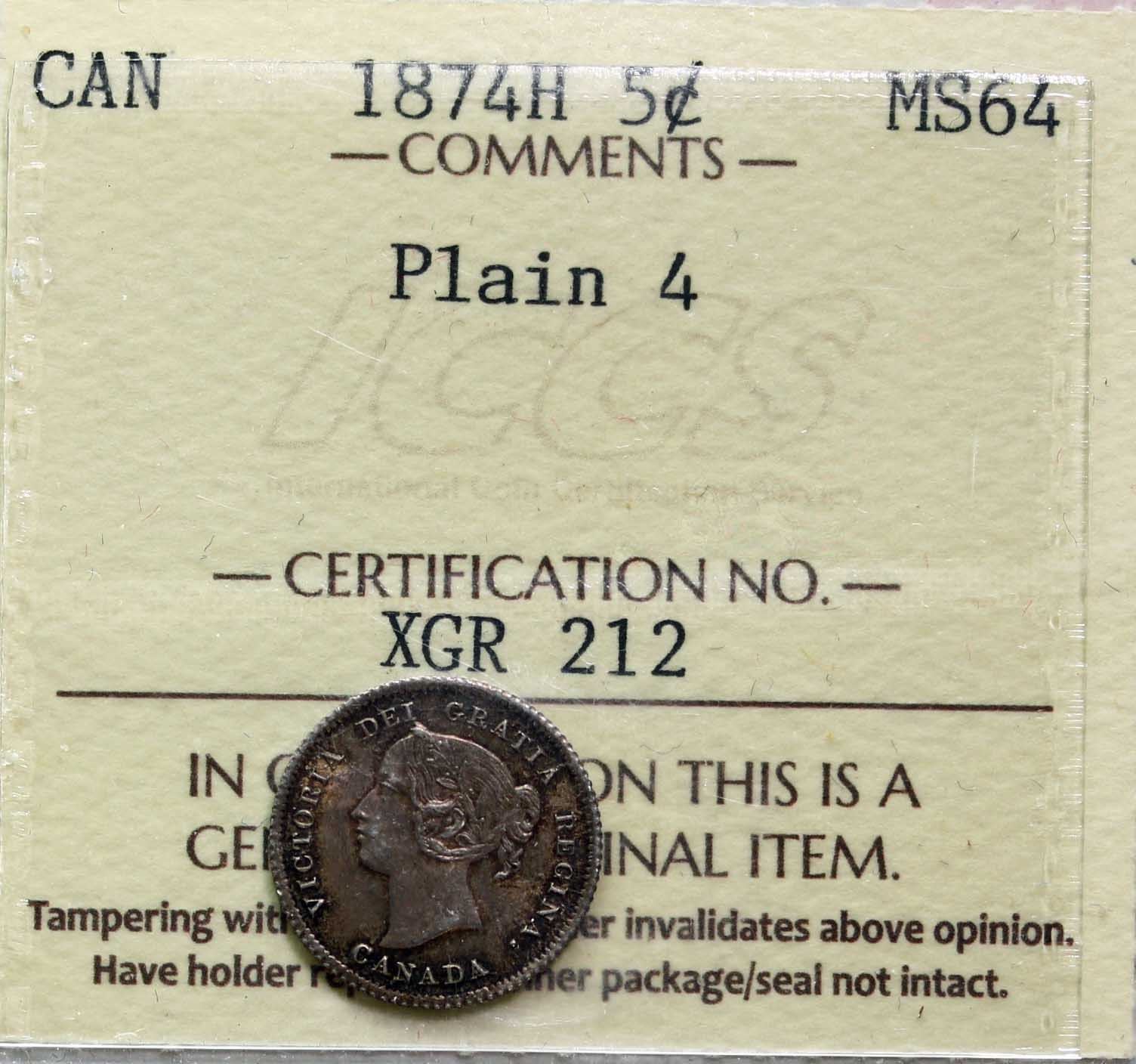 1874H 5¢ Plain 4 Wide Date ICCS Choice Mint State-64. Mild tan coloured shades over gem luster and mild cameo highlights. A superior example.