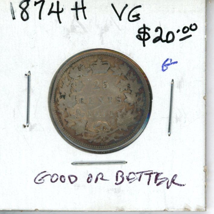 1874H Canadian Victorian Silver 25 Cents. Heaton Mint. Good or better.