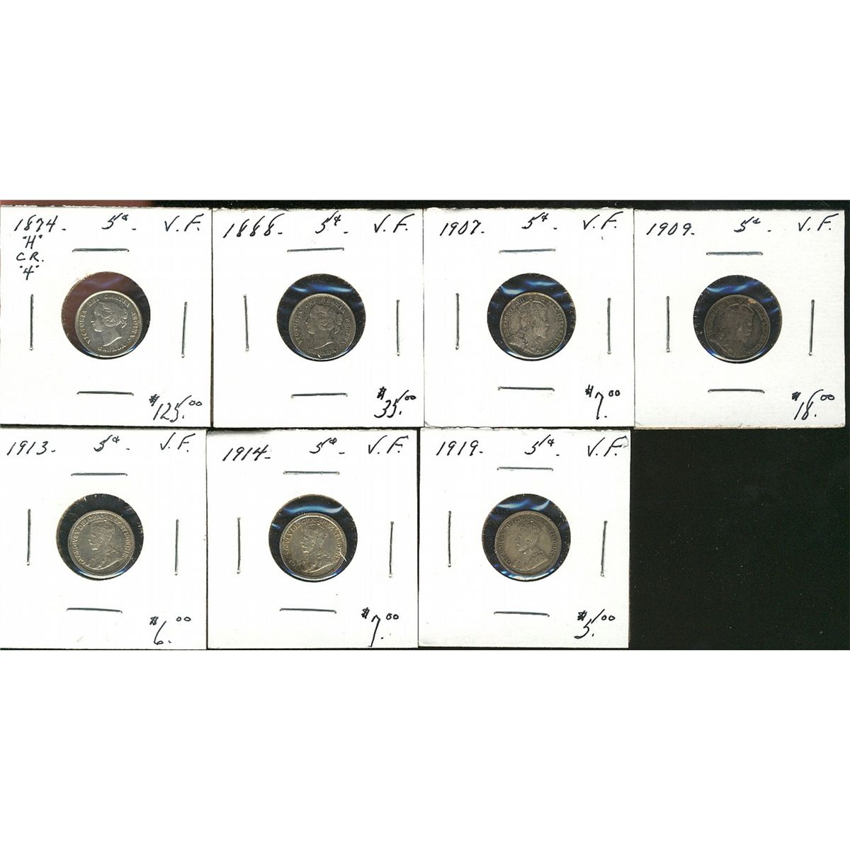 1874H Cr4 5¢, 1888, 1907, 1909, 1913, 1914 & 1919. Lot of 7 coins all VF. (PBA).