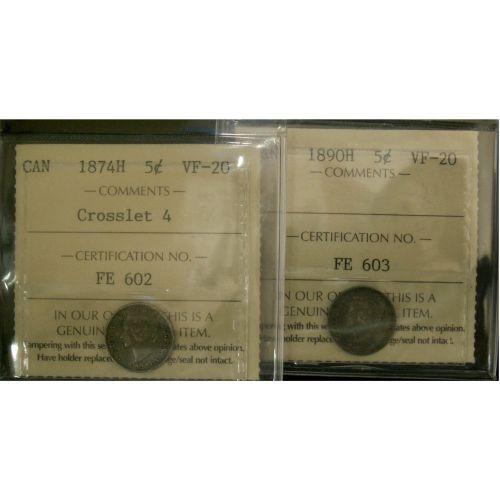 1874H and 1890H 5¢. Lot of two coins both ICCS VF20. 1874H designated Crosslet 4.