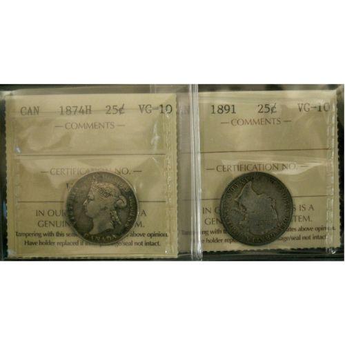 1874H and 1891 25¢. Lot of 2 coins both ICCS VG10