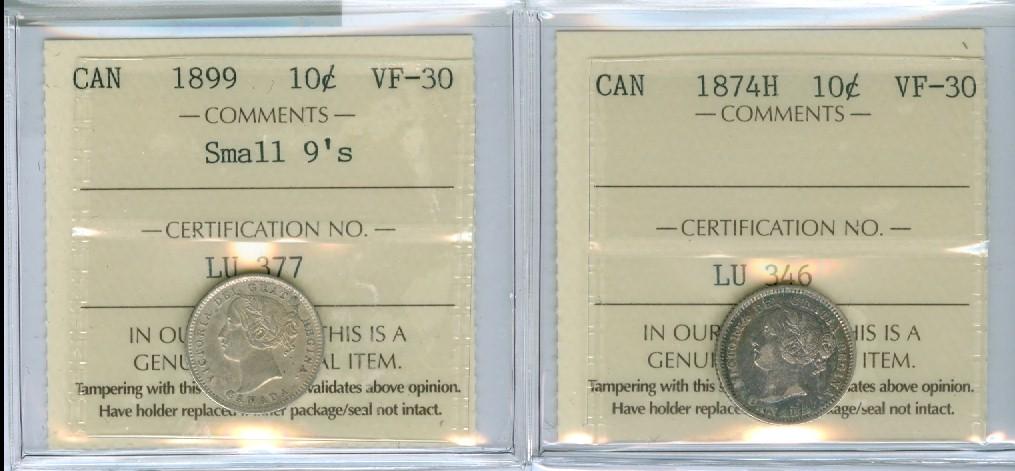 1874H and 1899 Sm. 9's Lot of 2 ICCS graded 10¢ coins, both VF30.