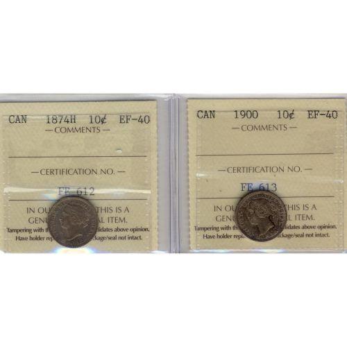 1874H and 1900 10¢. Lot of 2 coins both ICCS EF40.