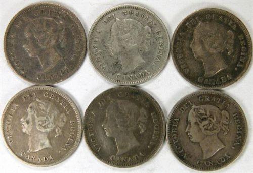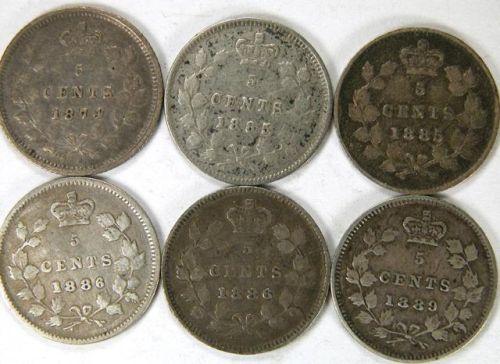 Canada Five Cents 1874H Crosslet 4, 1885 Large 5, 1885 Small 5, 1886 Large 6, 1886 Small 6 and 1889, all F-VF or better, and lightly toned