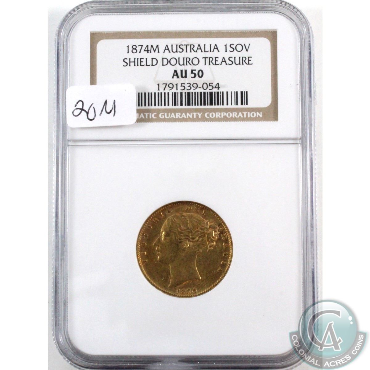 1874M Australia 1 Sovereign NGC Certified AU-50 Shield Douro Treasure.