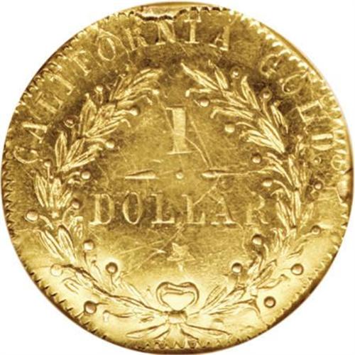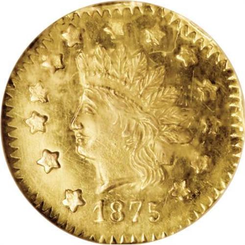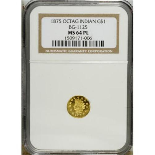 <B>1875 $1 Indian Octagonal 1 Dollar, BG-1125, Low R.5, MS64 Prooflike NGC.</B></I> Well struck and free of significant marks, this splendidly reflective example displays light green-gold color and a couple of minor lintmarks on the upper obverse field. The reverse die exhibits a network of branching cracks. Census: 2 in 64 Prooflike, 1 finer as MS67 DPL (7/07).<BR><BR><b>Shipping:</b> Coins & Currency (<a target="_blank" href="http://www.heritageauctions.com/common/shipping.php">view shipping information</a>)
