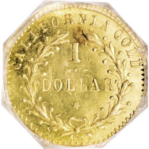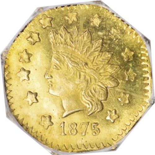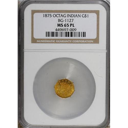 <B>1875 $1 Indian Octagonal 1 Dollar, BG-1127, R.4, MS65 Prooflike NGC.</B></I> Deeply reflective orange-yellow fields on each side, with DOLLAR fully readable and better struck than normal. A small spot of copper toning is noted on the reverse. The finest BG-1127 certified Prooflike by several grade points (three, to be precise) at NGC or PCGS (8/07), as well as the only MS65 at NGC.<BR><BR><b>Shipping:</b> Coins & Currency (<a target="_blank" href="http://www.heritageauctions.com/common/shipping.php">view shipping information</a>)