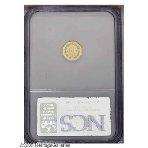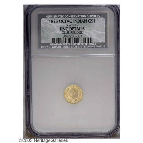 <B>1875<$1> Indian Octagonal 1 Dollar, BG-1112, High R.5--Glue Residue--NCS. UNC Details.</B></I> Well struck and unabraded, with a pleasing combination of orange and olive patina. A trace of glue residue is noticeable near obverse star 13.