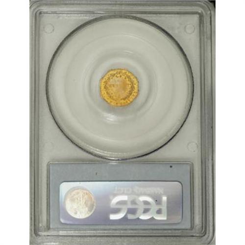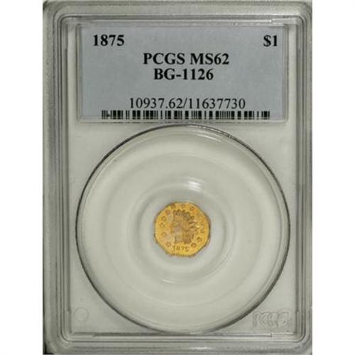 <B>1875 $1 Indian Octagonal 1 Dollar, BG-1126, R.5, MS62 PCGS.</B></I> A lemon-gold octagonal dollar with glimpses of ice-blue across the centers. The flashy fields lack visible marks, and the strike on DOLLAR is sharper than seen on the Breen-Gillio (Jay Roe) plate coin. Population: 8 in 62, 9 finer (12/07).<BR><BR><b>Shipping:</b> Coins & Currency (<a target="_blank" href="http://www.heritageauctions.com/common/shipping.php">view shipping information</a>)