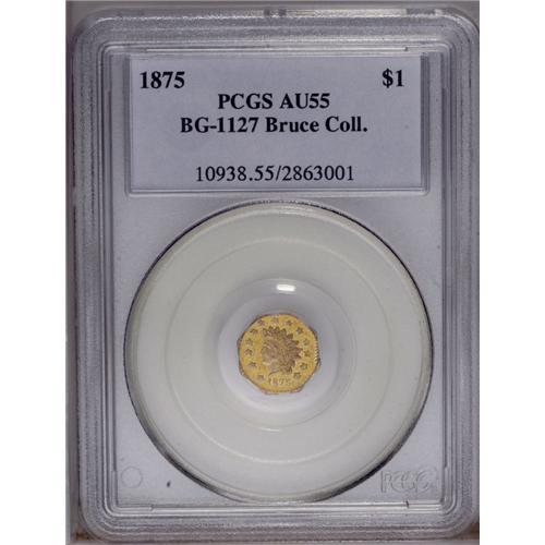 <B>1875<$1> Indian Octagonal 1 Dollar, BG-1127, R.4, AU55 PCGS.</B></I> Ex: Bruce Collection. Olive-gold fields complement lilac-toned devices. A few faint marks are customary for brief non-numismatic handling. Struck from rotated dies.