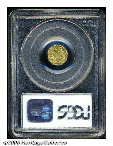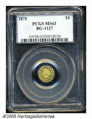 <B>1875<$1> Indian Octagonal 1 Dollar, BG-1127, R.4, MS63 PCGS.</B></I> An uncommonly attractive coin for the grade, neither side reveals any sizeable distractions. The obverse portrait is boldly defined and the denticles are full on both sides. A deeply prooflike example with rich green-gold color and about 45 degrees of counterclockwise die rotation.