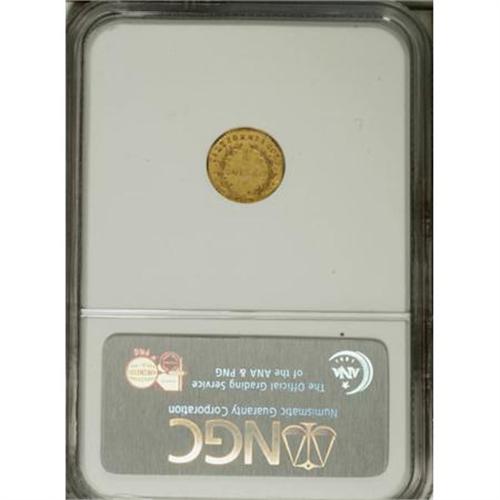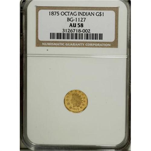 <B>1875 $1 Indian Octagonal 1 Dollar, BG-1127, R.4, AU58 NGC.</B></I> A butter-yellow example of this interesting octagonal gold dollar issue, well struck with a measure of reflectivity in the obverse fields. The portrait shows a touch of highpoint friction.<BR><BR><b>Shipping:</b> Coins & Currency (<a target="_blank" href="http://www.heritageauctions.com/common/shipping.php">view shipping information</a>)