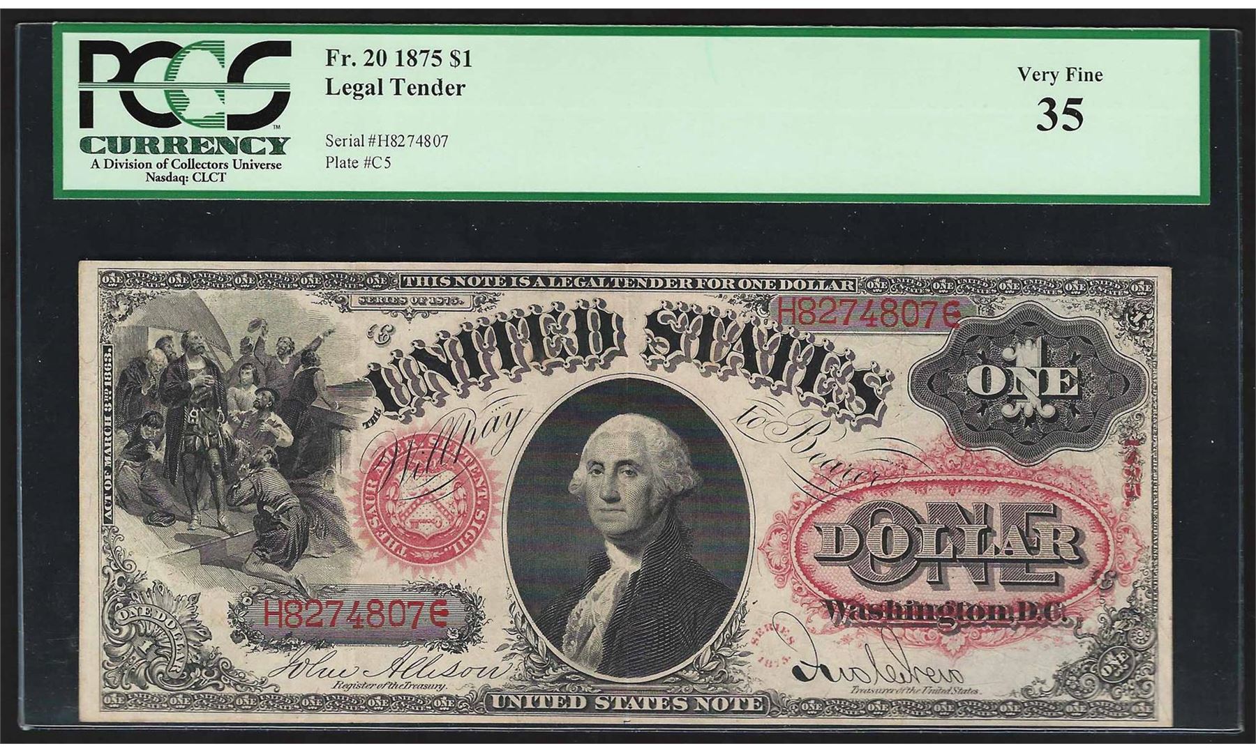 One 1875 $1 Legal Tender Note Fr.20 PCGS Very Fine 35. PCGS Graded.