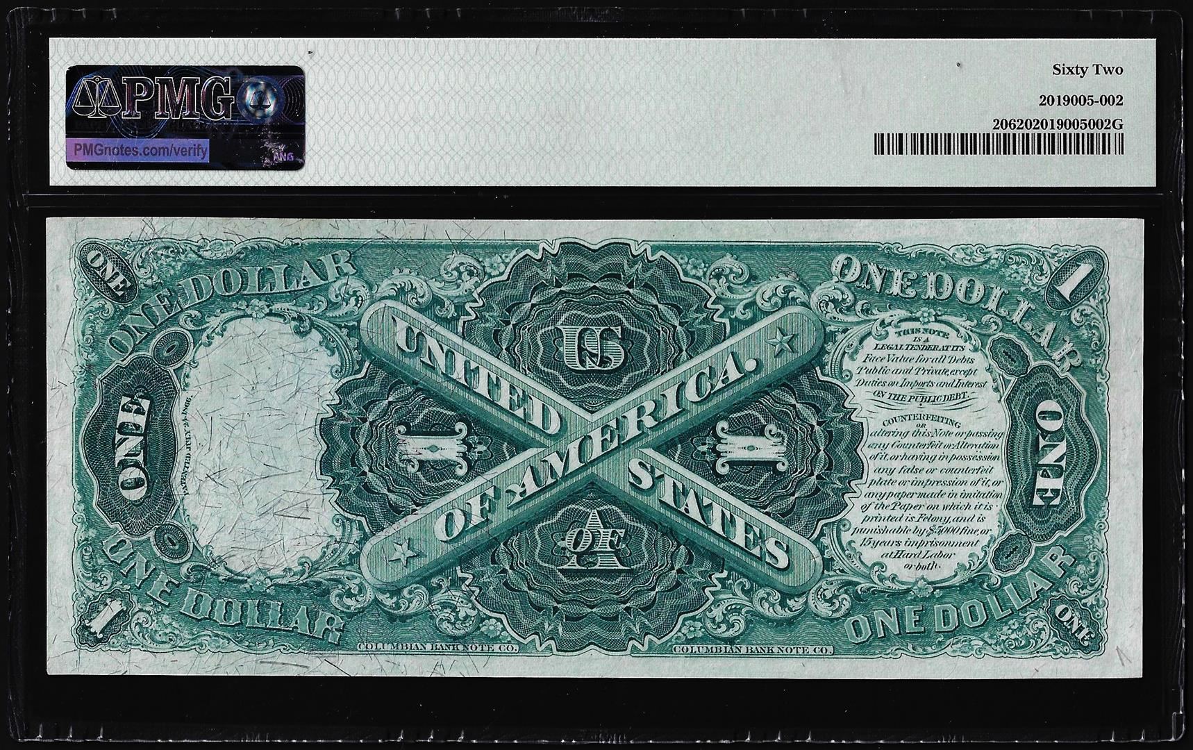 One 1875 $1 Legal Tender Note Fr.20 PMG Uncirculated 62. PMG Certified.