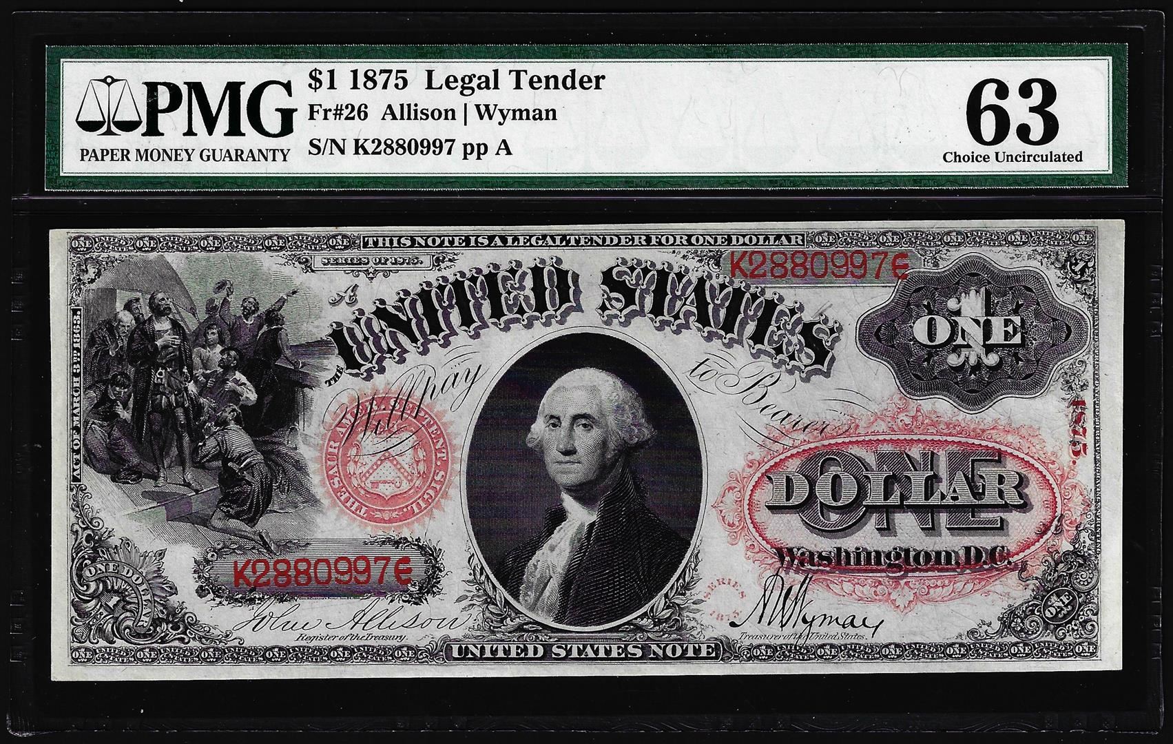One 1875 $1 Legal Tender Note Fr.26 PMG Choice Uncirculated 63. PMG Certified.