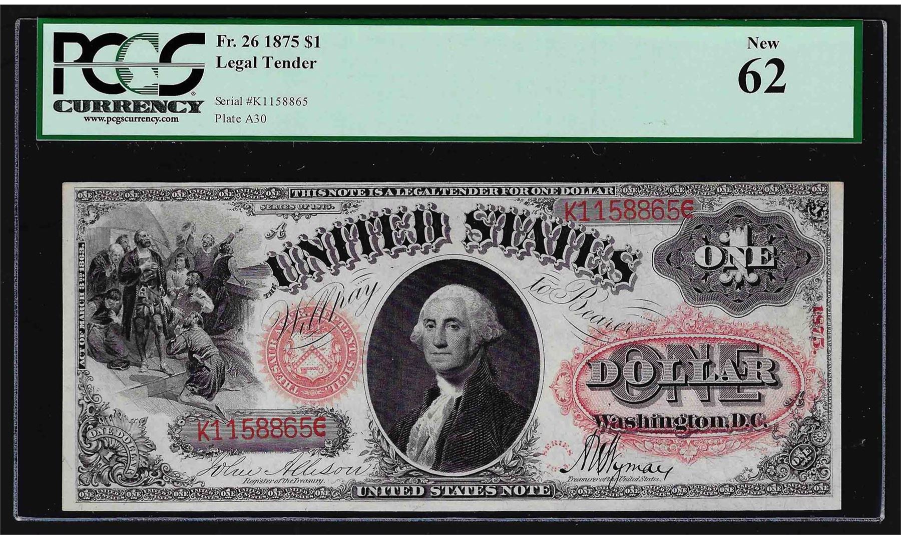 One 1875 $1 Legal Tender Note PCGS New 62. PCGS Certified.