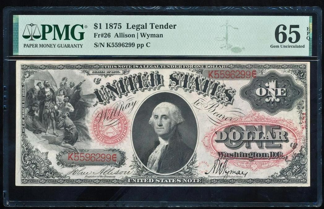 One 1875 $1 Legal Tender Note PMG 65EPQ.