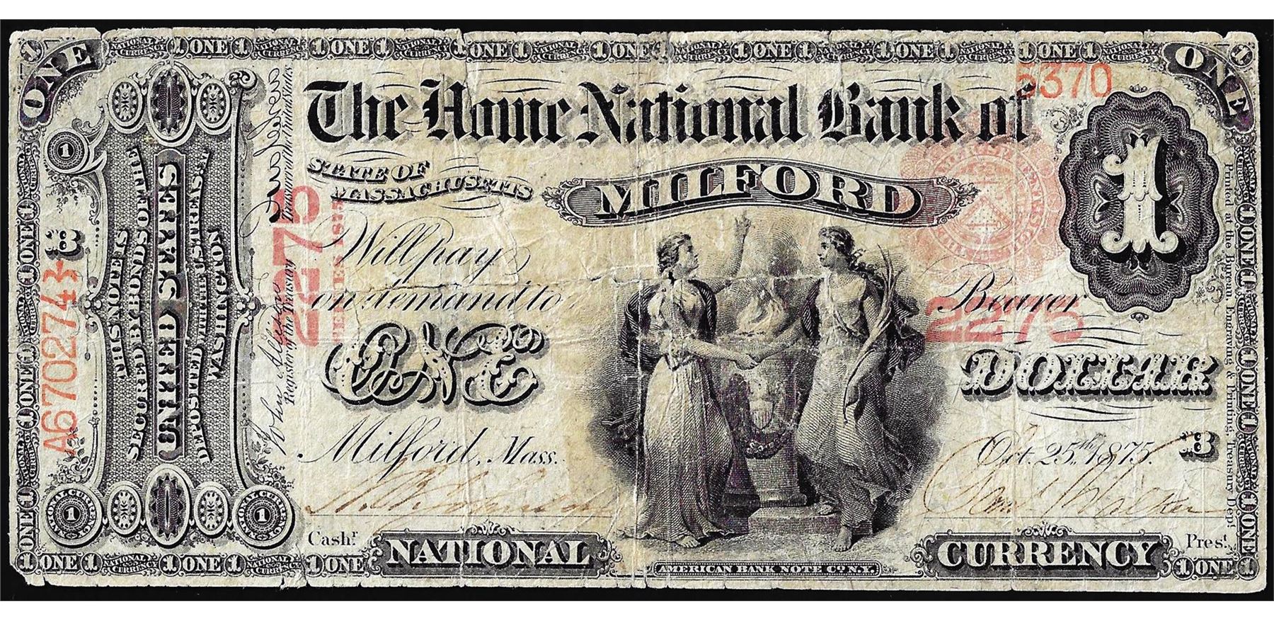 One 1875 $1 National Bank of Milford, MA CH# 2275 National Currency Note.