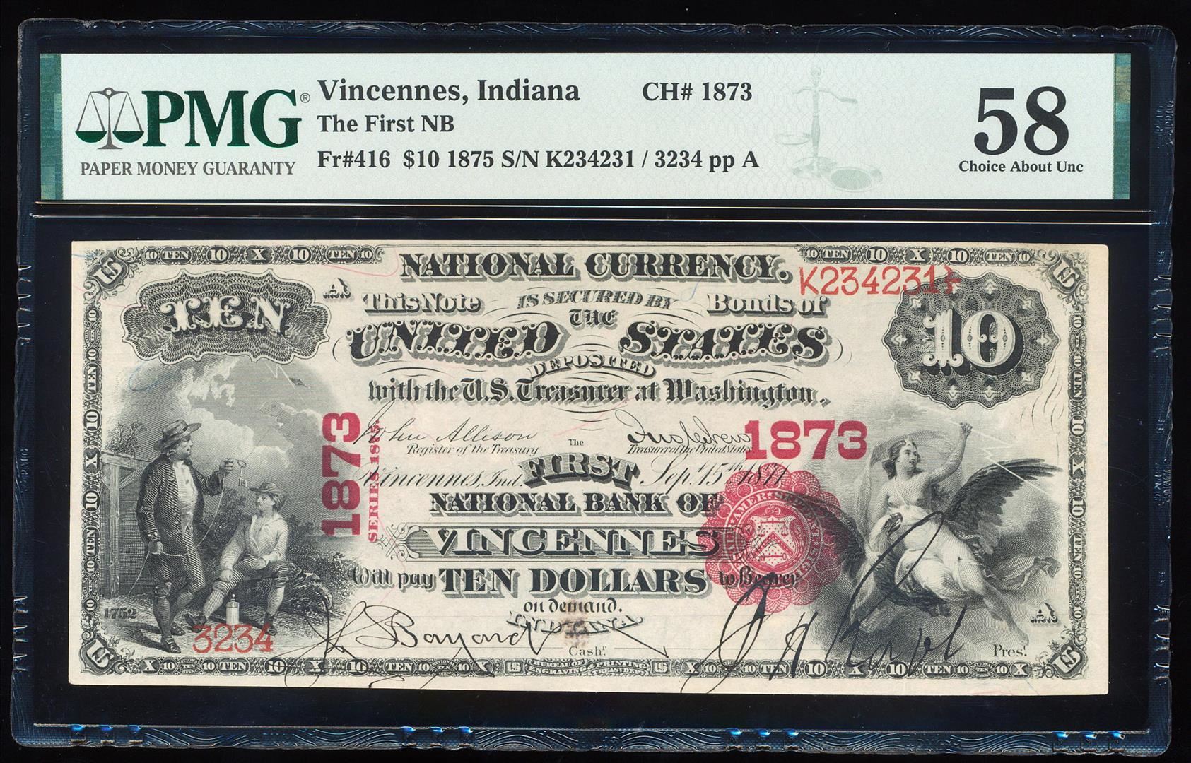 One 1875 $10 First Charter Vincennes, Indiana CH# 1873 National Note PMG Ch. AU58. PMG Certified.