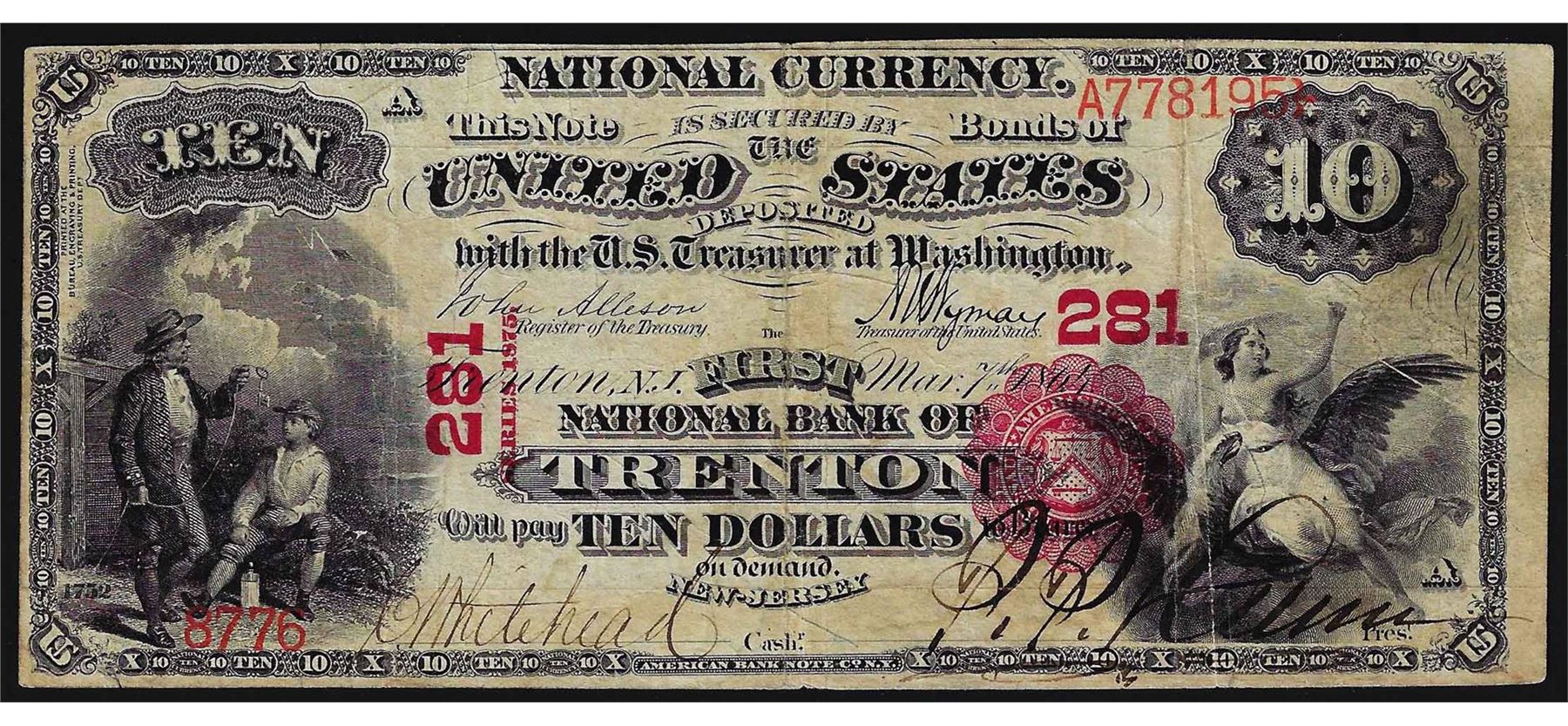 1875 $10 First National Bank CH# 281 Trenton, NJ National Currency Note