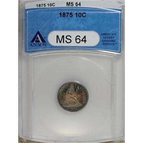 <B>1875 10C MS64 ANACS.</B></I> NGC Census: (104/97). PCGS Population (71/54). Mintage: 10,350,700. Numismedia Wsl. Price for NGC/PCGS coin in MS64: $320. (#4672)<BR><BR><B>Coin Engraver:</B> Christian Gobrecht<BR><BR><b>Shipping:</b> Coins & Currency (<a target="_blank" href="http://www.heritageauctions.com/common/shipping.php">view shipping information</a>\)