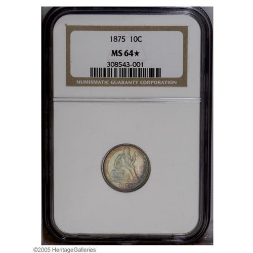 1875 10C MS64 S NGC. Nicely defined with silver and p 1875[10C] MS64 [S NGC.