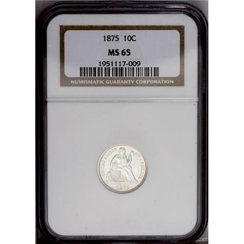 <B>1875<10C> MS65 NGC.</B></I> Pleasing frosty luster characterizes each side of this essentially untoned, attractive Gem. Small abrasions on the cheek and chest preclude an even higher grade.