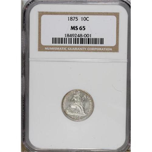 <B>1875 10C MS65 NGC.</B></I> Tan-brown toning is generally limited to the reverse periphery. A boldly struck and satiny Gem that exhibits faint clash marks on both fields. Census: 49 in 65, 48 finer (5/07).<BR><BR><b>Shipping:</b> Coins & Currency (<a target="_blank" href="http://www.heritageauctions.com/common/shipping.php">view shipping information</a>)
