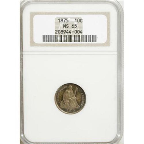 <B>1875 10C MS65 NGC.</B></I> A distinguished Gem representative, the surfaces of this piece are draped in multicolored shades of original patina that are highlighted by vibrant underlying mint luster. An attractive, boldly struck dime that is well preserved and shows just two or three minute marks. Census: 49 in 65, 48 finer (10/07). <BR><BR><B>Coin Engraver:</B> Christian Gobrecht<BR><BR><b>Shipping:</b> Coins & Currency (<a target="_blank" href="http://www.heritageauctions.com/common/shipping.php">view shipping information</a>)