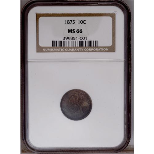 1875 10C MS66 NGC. Deeply patinated in autumn-brown an 1875[10C] MS66 NGC.