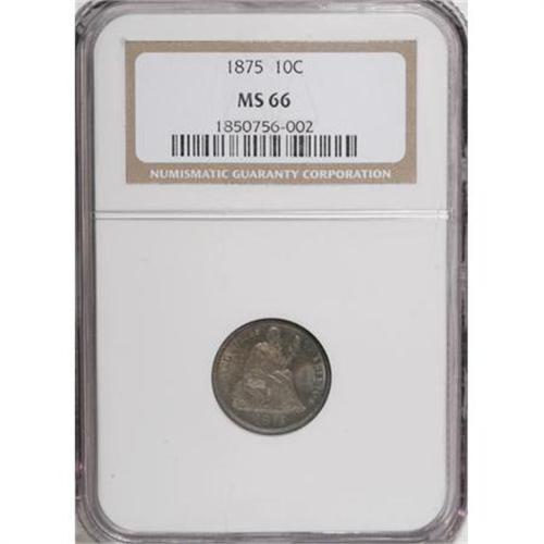<B>1875 10C MS66 NGC.</B></I> Gray color is made more complex by the presence of light green and blue undertones. Below lies shimmering luster and the strike is bold, with only a touch of weakness noticed at the centers. Infrequently found finer. Census: 41 in 66, 7 finer (12/07).<BR><BR><B>Coin Engraver:</B> Christian Gobrecht<BR><BR><b>Shipping:</b> Coins & Currency (<a target="_blank" href="http://www.heritageauctions.com/common/shipping.php">view shipping information</a>)