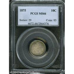 1875 10C MS66 PCGS. Richly toned in apricot, ocean <B>1875 10C MS66 PCGS.</B></I> Richly toned in apricot, ocean-blue, and cream-gray colors. A suitably struck and undisturbed premium Gem. An available issue in lower Mint State grades, but tough in this lofty grade. Population: 24 in 66, 3 finer (10/04). <BR><BR><B>Important notice:</B> Heritage usually auctions material at the rate of 200-250 lots per hour. On some occasions eBay Live bid software or the Internet may not be able to keep up with the pace of the auction. We recommend placing a realistic absentee bid now as insurance to avoid disappointment. Occasionally the auctioneer may eliminate or reject an eBay Live bid, and the auctioneer may also reopen a lot after the close of the eBay live bidding (usually because we missed an audience bid), and may reject your bid even if it shows you as the winning bidder. By bidding via eBay Live, you agree that Heritage may award the lot to another bidder at its sole discretion under the circumstances described above or any other reasonable circumstances. Since eBay bids are not shown to us until we open the lot on the floor, we treat those bids just like floor bids. In most cases the floor responds before the eBay bid is presented to us, due to Internet lag time, so for consistency we have made it a policy that floor bids are always considered first over tie eBay live bids. Also please note that all Heritage lots purchased through eBay Live carry a 20% Buyer's Premium. Please make sure you read the Terms and Conditions before you bid. This lot is being auctioned in conjunction with a live floor auction by Heritage Galleries & Auctioneers. All final auction and invoice information will be supplied by Heritage Galleries & Auctioneers, and all other information should be considered preliminary. Lot:5717