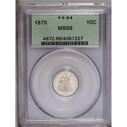 <B>1875<10C> MS66 PCGS.</B></I> This flashy Premium Gem is well struck aside from Liberty's hair, and the lightly toned fields are decidedly prooflike. An exquisitely preserved Seated type coin. Population: 22 in 66, 3 finer (3/06).