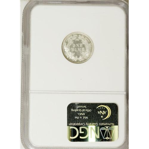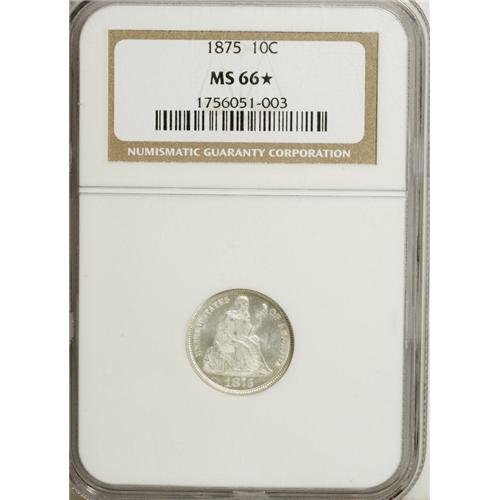 <B>1875 10C MS66 <img border='0' src='http://www.heritagecoins.com/images/star.gif' width=10 height=10> NGC.</B></I> Frosty devices combined with mirrored fields create interesting contrast on each side. The surfaces are stone-white save for hints of dappled gold color at the borders. The design elements are well-defined, and the overall preservation is amazing. NGC has graded only seven Superb Gems (4/07).<BR><BR><b>Shipping:</b> Coins & Currency (<a target="_blank" href="http://www.heritageauctions.com/common/shipping.php">view shipping information</a>)