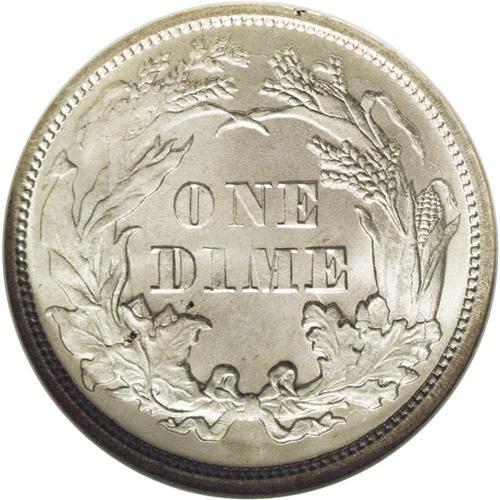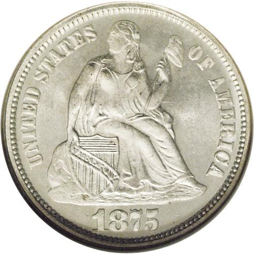 <B>1875<10C> MS67 NGC.</B></I> A glittering Gem Seated dime type coin. The obverse field is noticeably prooflike and the device is moderately frosted creating a cameo effect on that side, the reverse is satiny overall. There are a couple of small, dark spots on the reverse, but these hardly detract. The strike is superb with excellent detail. This is one of only seven MS67 specimens of this date presently graded by NGC, none are finer at either service (4/06).