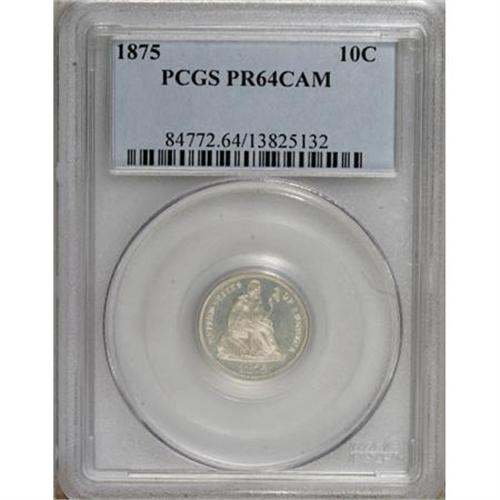 <B>1875 10C PR64 Cameo PCGS.</B></I> Light tan-gray toning visits this precisely struck and unmarked near-Gem. The devices are evenly frosted. Only 700 proofs were struck. Population: 9 in 64 Cameo, 9 finer (7/07).<BR><BR><b>Shipping:</b> Coins & Currency (<a target="_blank" href="http://www.heritageauctions.com/common/shipping.php">view shipping information</a>)