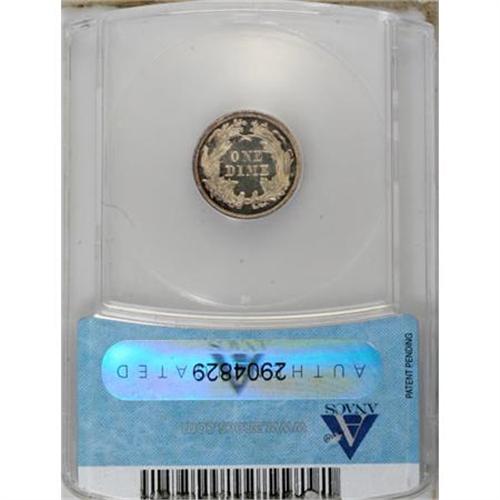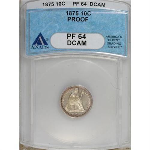 <B>1875 10C PR64 Deep Cameo ANACS.</B></I> Dashes of sea-green and tobacco-brown enrich the margins of this boldly struck and flashy near-Gem. The devices are thickly frosted. A mere 700 proofs were produced.<BR><BR><b>Shipping:</b> Coins & Currency (<a target="_blank" href="http://www.heritageauctions.com/common/shipping.php">view shipping information</a>)