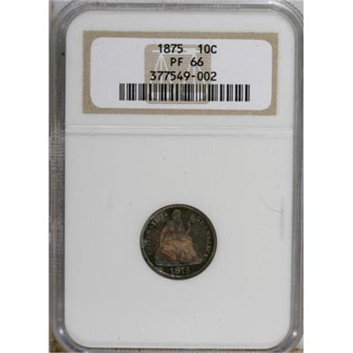 <B>1875 10C PR66 NGC.</B></I> Gorgeous electric-blue, turquoise-green, and reddish-amber toning graces the exquisitely preserved surfaces of this Premium Gem proof. Sharply struck, as expected, with just a bit of typical weakness noted on Liberty's hair detail. One of only 700 proofs struck. Census: 15 in 66, 3 finer (7/07). <BR><BR><B>Coin Engraver:</B> Christian Gobrecht<BR><BR><b>Shipping:</b> Coins & Currency (<a target="_blank" href="http://www.heritageauctions.com/common/shipping.php">view shipping information</a>)