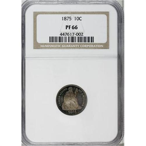 <B>1875 10C PR66 NGC.</B></I> Well struck with originally toned surfaces that show a variegated mixture of colors on both obverse and reverse, including a substantial swath of electric-blue toning near the borders. The fields remain nicely reflective, and offer pleasing contrast with the motifs. We can report no distracting surface marks on either side of this gorgeous Premium Gem. Census: 15 in 66, 3 finer (3/08).<BR><BR><B>Coin Engraver:</B> Christian Gobrecht<BR><BR><b>Shipping:</b> Coins & Currency (<a target="_blank" href="http://www.heritageauctions.com/common/shipping.php">view shipping information</a>)