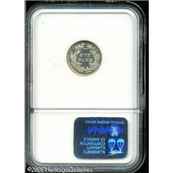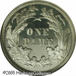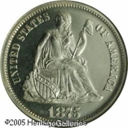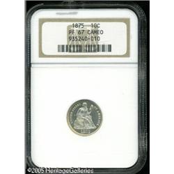<B>1875 10C PR67 Cameo NGC.</B></I> This is a stunning and glittering Cameo Proof with exceptional surfaces. The fields are deeply mirrored, and the devices are fully lustrous with frosty white color. Like most other Superb Gem Proofs, it is sharply struck and highly attractive. Both the obverse and the reverse are fully brilliant without any evidence of toning, save for a wisp of light champagne. Population: 3 in 67, 0 finer (1/05). Lot:6255